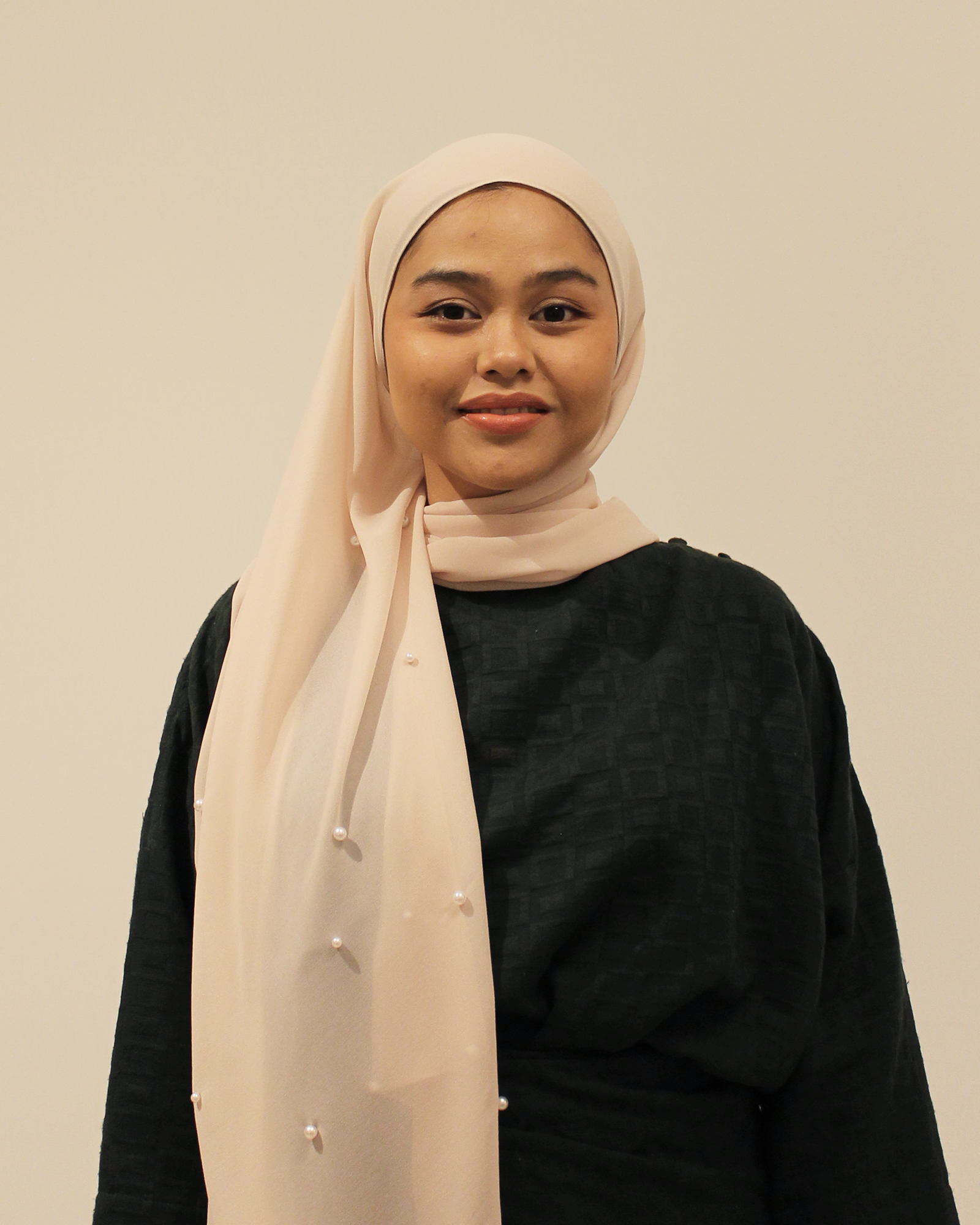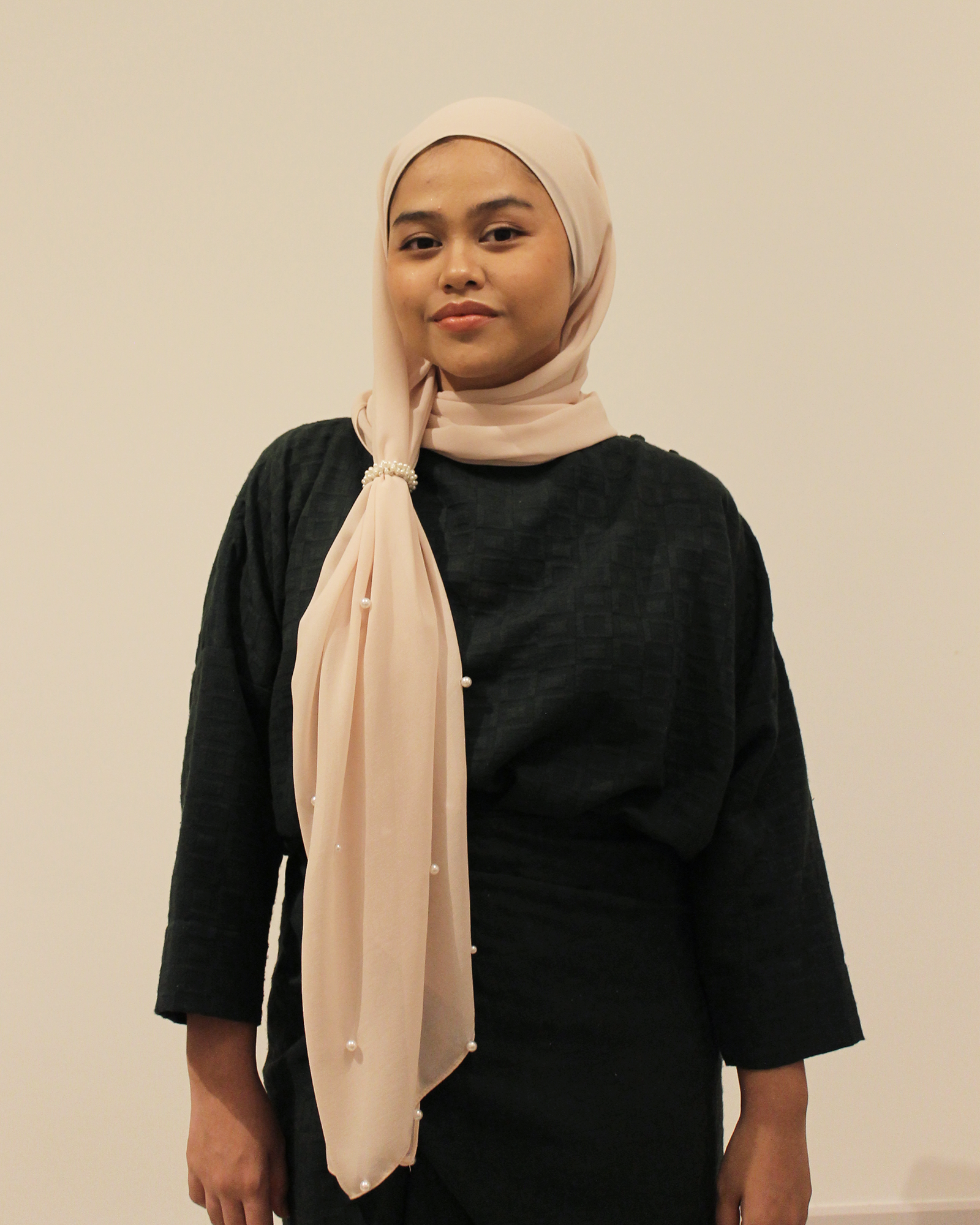 Chiffon shawl with babyseam finishings on all sides with pearls embedded in scattered pattern on one side of the shawl.